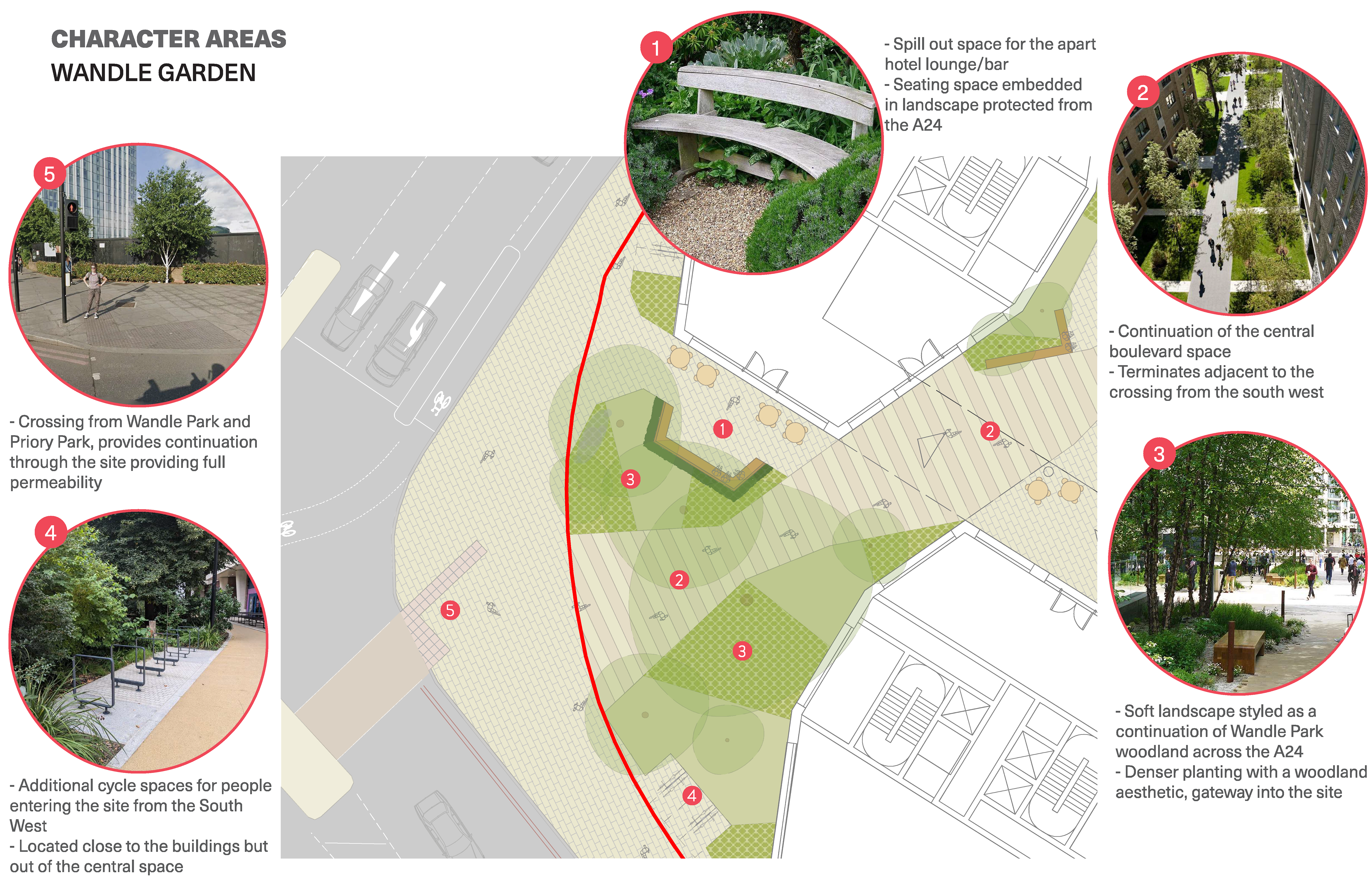 Our aim is to bring forward a landscape-led development that respects the Town Centre location and provides new crossing routes to connect the town centre and local homes and businesses with Wandle Park to the west of the site.